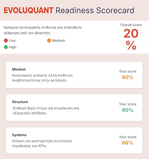Σε κάθε έργο συμβουλευτικής για ουσιαστικό μετασχηματισμό επιχειρήσεων ξεκινάμε από την ίδια ερώτηση: Πόσο έτοιμη είναι πραγματικά η επιχείρηση για την αλλαγή που επιθυμεί να επιφέρει ο ιδρυτής, ο ιδιοκτήτης ή ο CEO της; Το EvolveU Business Readiness Scorecard συνοψίζει αυτή την πρώτη κρίσιμη φάση σε μια απλή, δομημένη εμπειρία επτά έως 10 λεπτών.